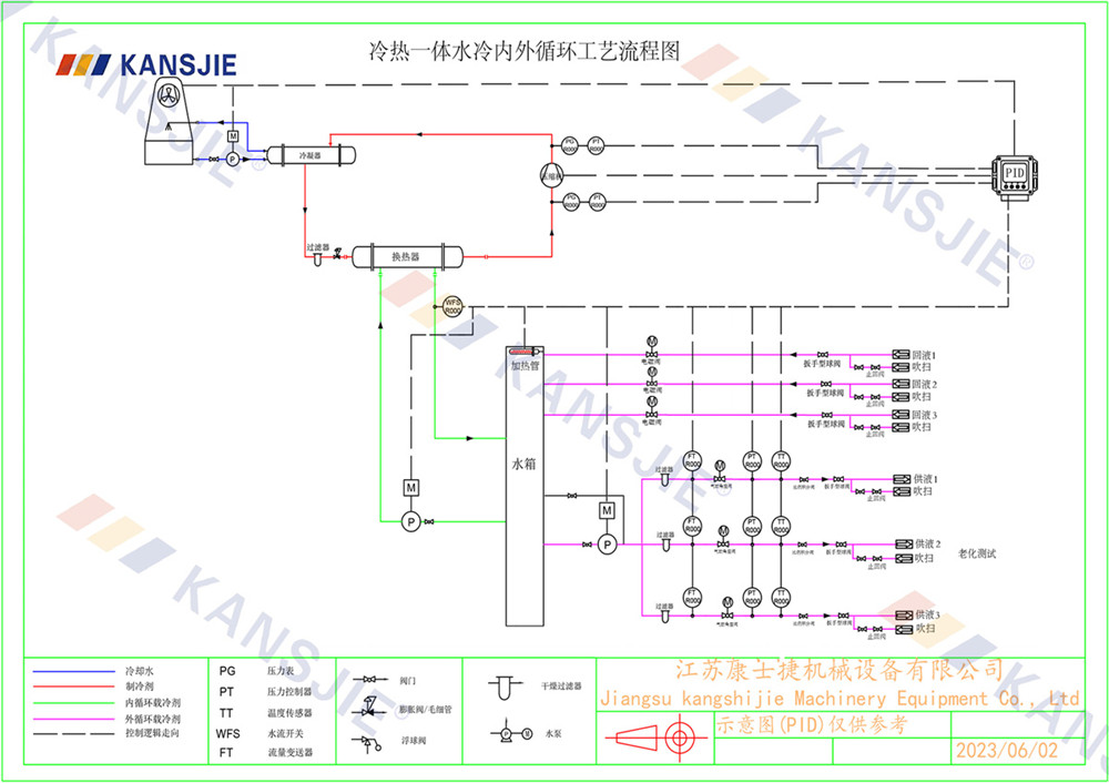 老化測(cè)試制冷系統(tǒng)由壓縮機(jī),冷凝器,蒸發(fā)器,膨脹閥組成,制冷原理是通過(guò)壓縮機(jī)壓縮冷媒,高溫高壓的氣態(tài)冷媒從壓縮機(jī)排氣口排出到冷凝器進(jìn)行降溫散熱,從而實(shí)現(xiàn)把高溫高壓的冷媒冷凝成中溫高壓的液態(tài)冷媒,被冷凝的冷媒經(jīng)過(guò)節(jié)流裝置節(jié)流降壓成半液態(tài)半氣態(tài)的冷媒進(jìn)入到蒸發(fā)器內(nèi)進(jìn)行蒸發(fā),冷媒在蒸發(fā)器中進(jìn)行蒸發(fā)吸熱,把蒸發(fā)器水側(cè)的冷凍水溫度降下去,顯示制造冷水的效果,冷媒在蒸發(fā)器內(nèi)進(jìn)行充分的吸熱蒸發(fā)后再?gòu)膲嚎s機(jī)吸氣口吸入壓縮機(jī)進(jìn)行壓縮,不斷的重復(fù)循環(huán) ,制冷系統(tǒng)正是通過(guò)這一系列的往復(fù)循環(huán)不斷的把冷量輸出到載冷劑中,然后再由循環(huán)泵把載冷劑源不斷的輸送到老化測(cè)試儲(chǔ)液箱中進(jìn)行冷卻降溫。一般老化測(cè)試的大多都是多通道式,并且具備吹掃功能。
