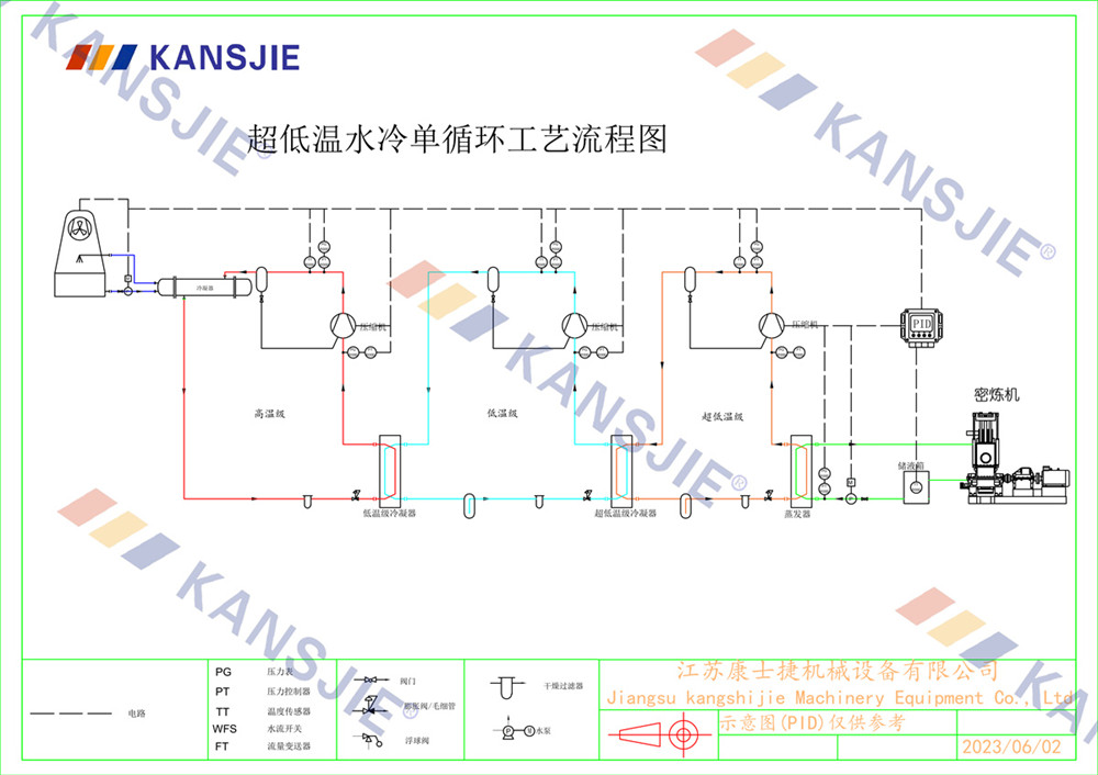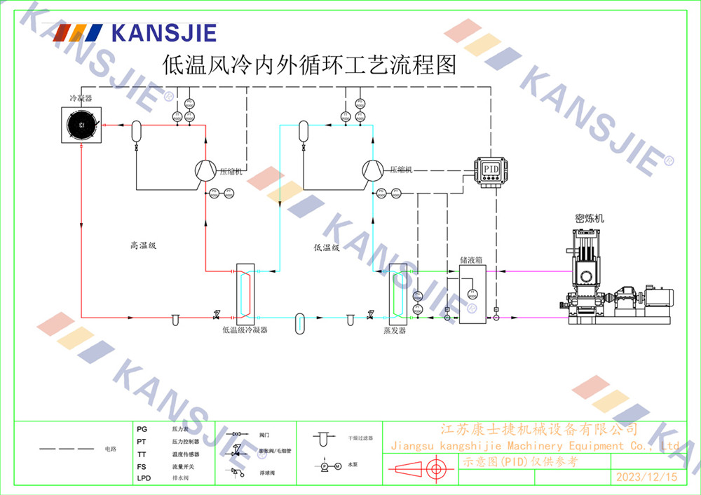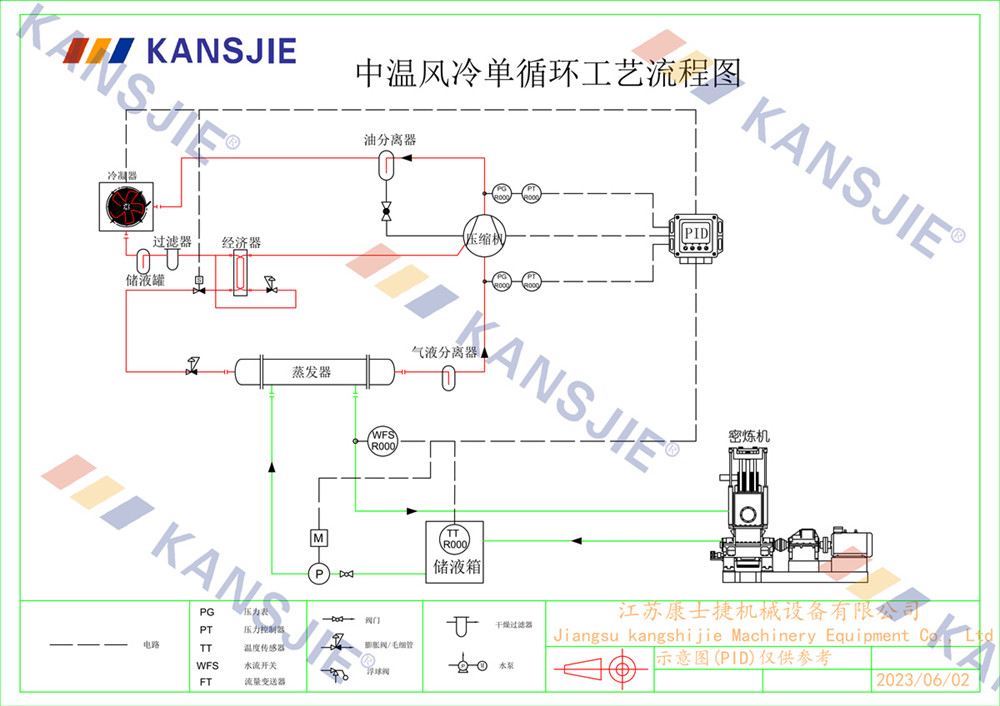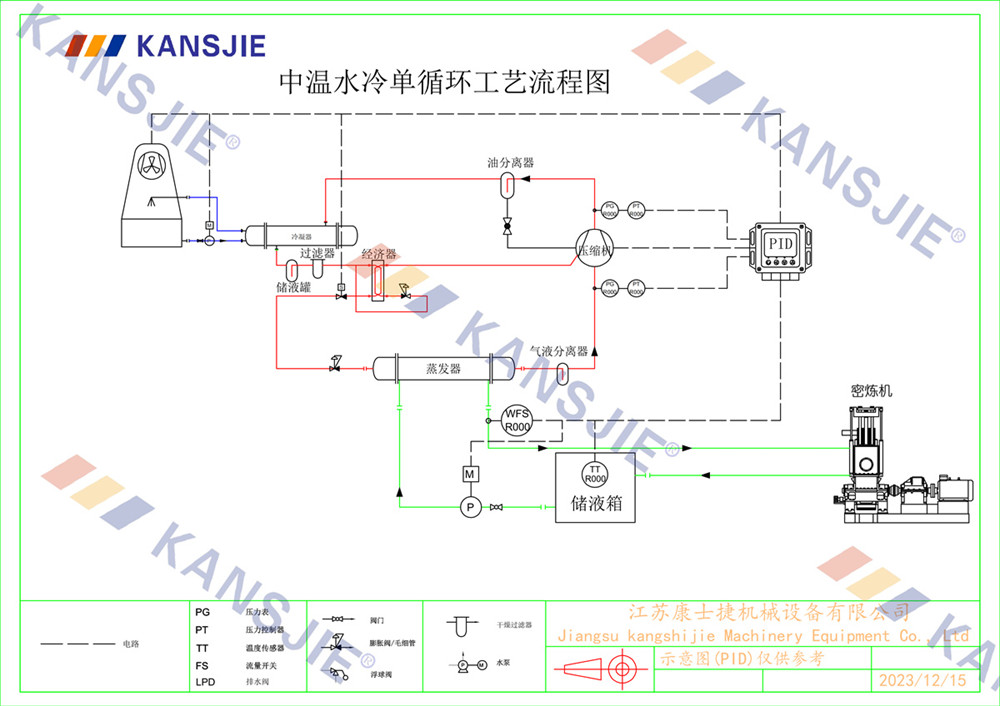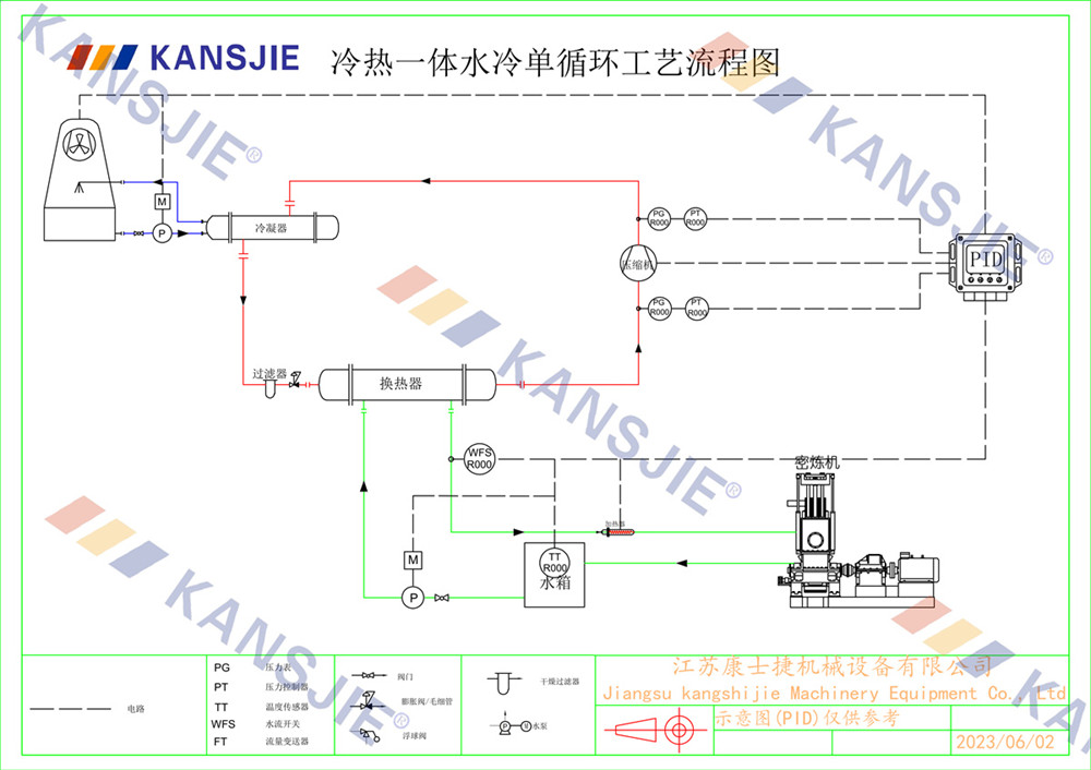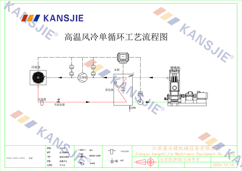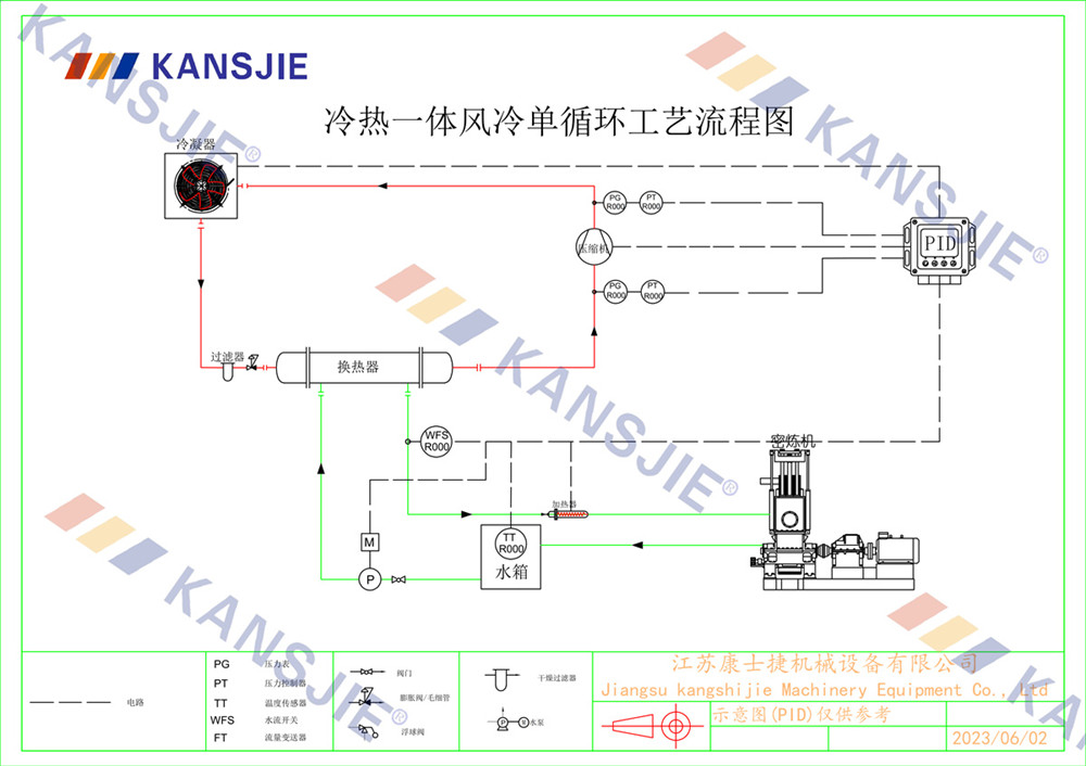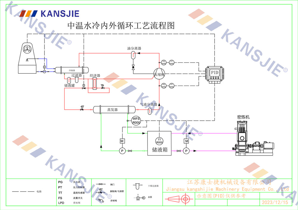 冷水機通過調節冷卻凍水的流量和溫度,將密煉機的溫度穩定地控制在工藝要求的范圍內。當密煉機內部溫度過高時,冷水機提供低溫的冷凍水,吸收多余熱量,降低密煉機溫度,當溫度過低時冷水機適當調節冷凍水流量或溫度,保持穩定的溫度。